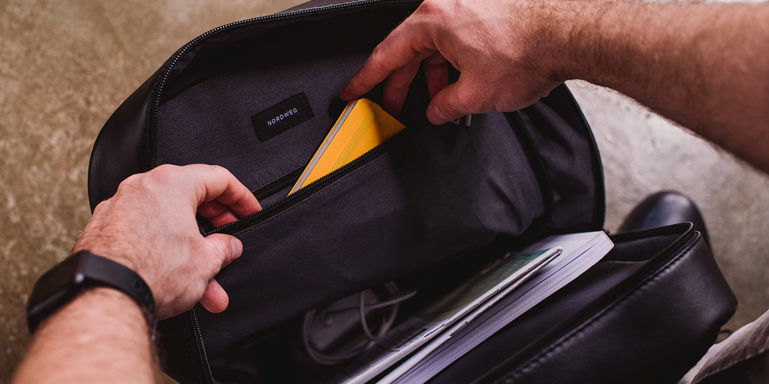 Included with the Nomad backpack is a leather case for laptops up to 15.6 inches.